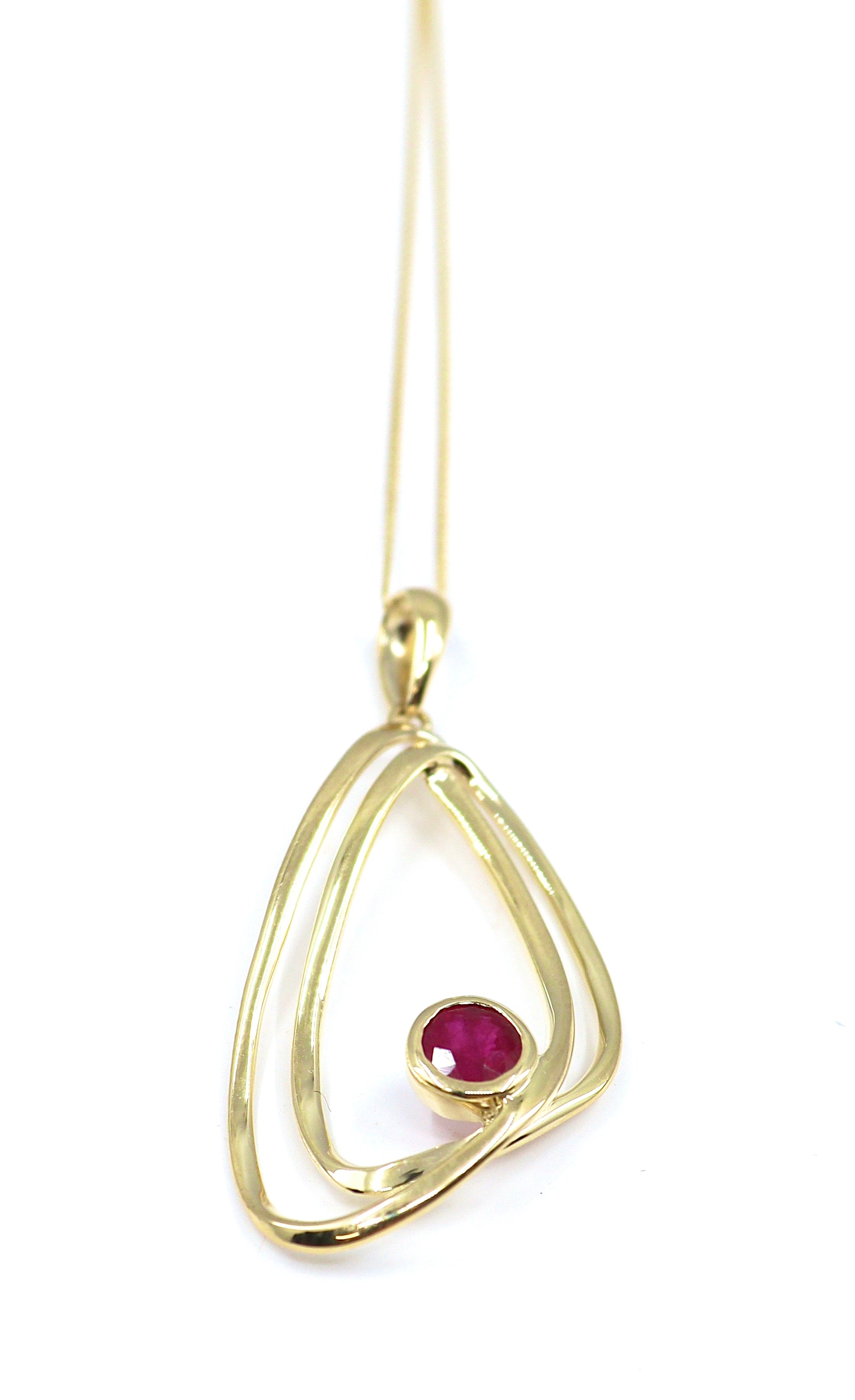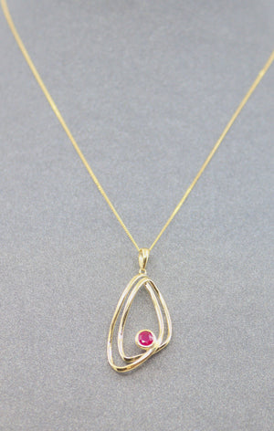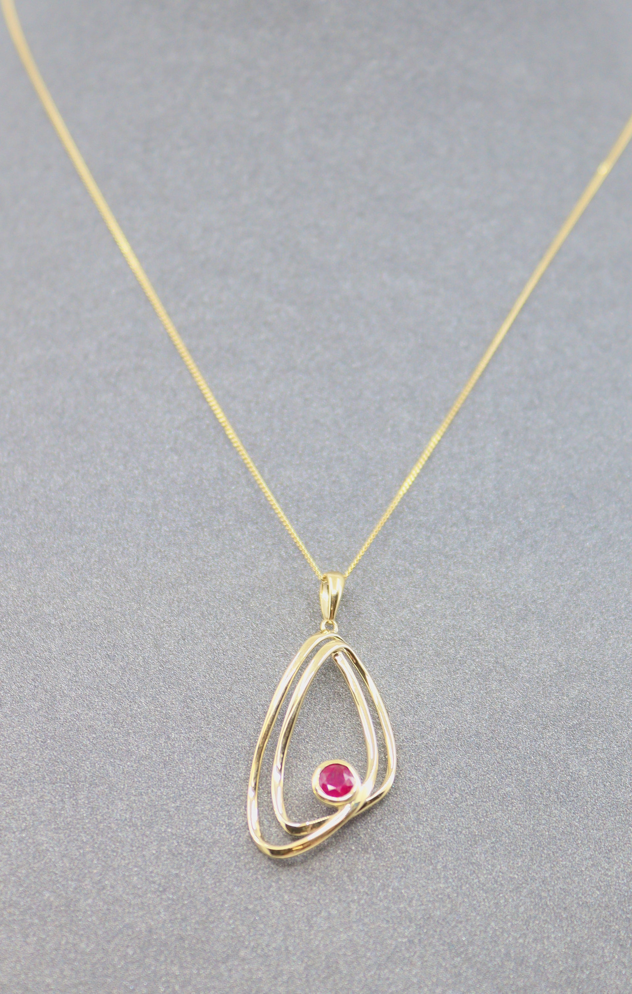 Indulge in the timeless elegance of the Intrigue Ruby Pendant, a luxurious masterpiece destined to be cherished for generations. At its centre lies a captivating 0.20ct red ruby, exuding a rich and vibrant allure. This exquisite gem is embraced by two lustrous 9ct yellow bars, creating a stunning contrast that enhances its beauty. Elevate your collection with this sophisticated piece, where classic design meets unparalleled luxury.